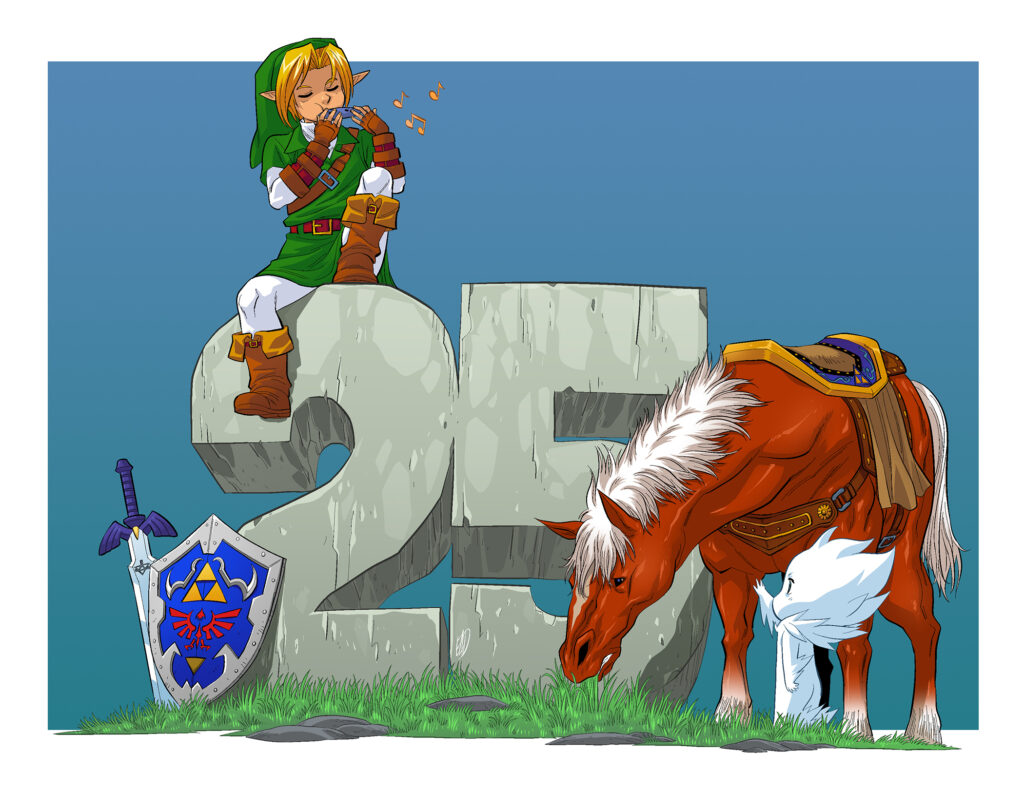 Celebrating the 25th Anniversary of The Legend of Zelda: Ocarina of Time, Ermis presents a celebratory piece featuring Link and Epona.